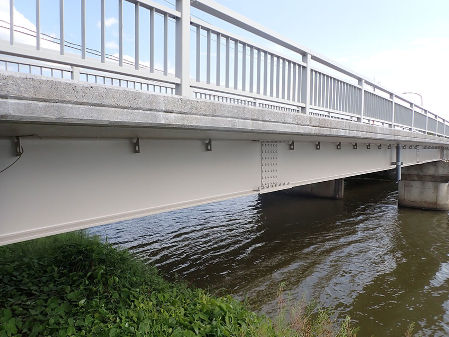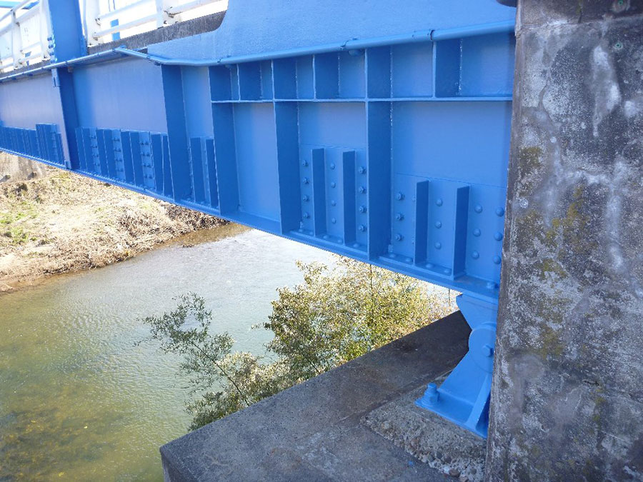 過年度橋梁点検により損傷の進行が確認された、主要地方道 珠洲里線 輪島市町野町川西地内に架かる明治橋について、詳細調査を行い、補修工法の検討および補修設計を行いました。詳細調査の結果、上部工鋼材全体に錆が発生しており、特に主桁ウェブ下端部の腐食が著しく、広範囲に腐食による孔食が確認できました。そのため、上部工鋼材全体の塗装塗替えを計画し、孔食箇所には当て板による補修計画を立案しました。