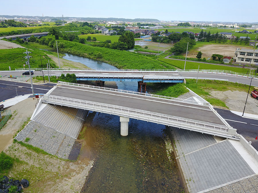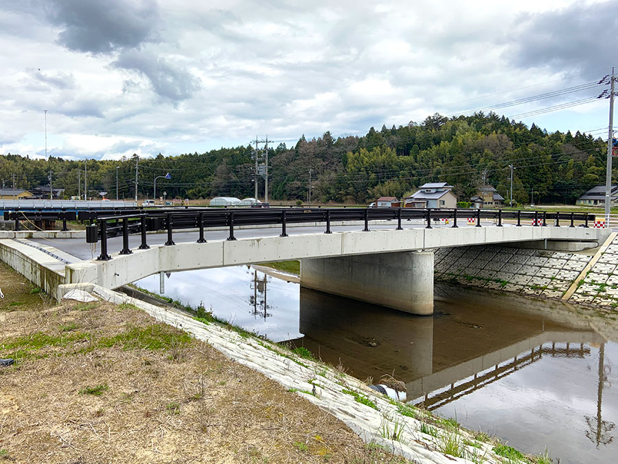 この路線のうち、動橋川(いぶりはしがわ)に架かる勅使大橋は、老朽化が進行していました。さらに、前後の区間に比べて幅員が狭く、大型車同士のすれ違いに支障をきたしていたため、今回、架け替えを実施しました。