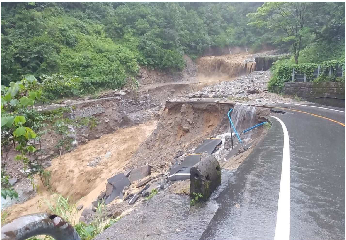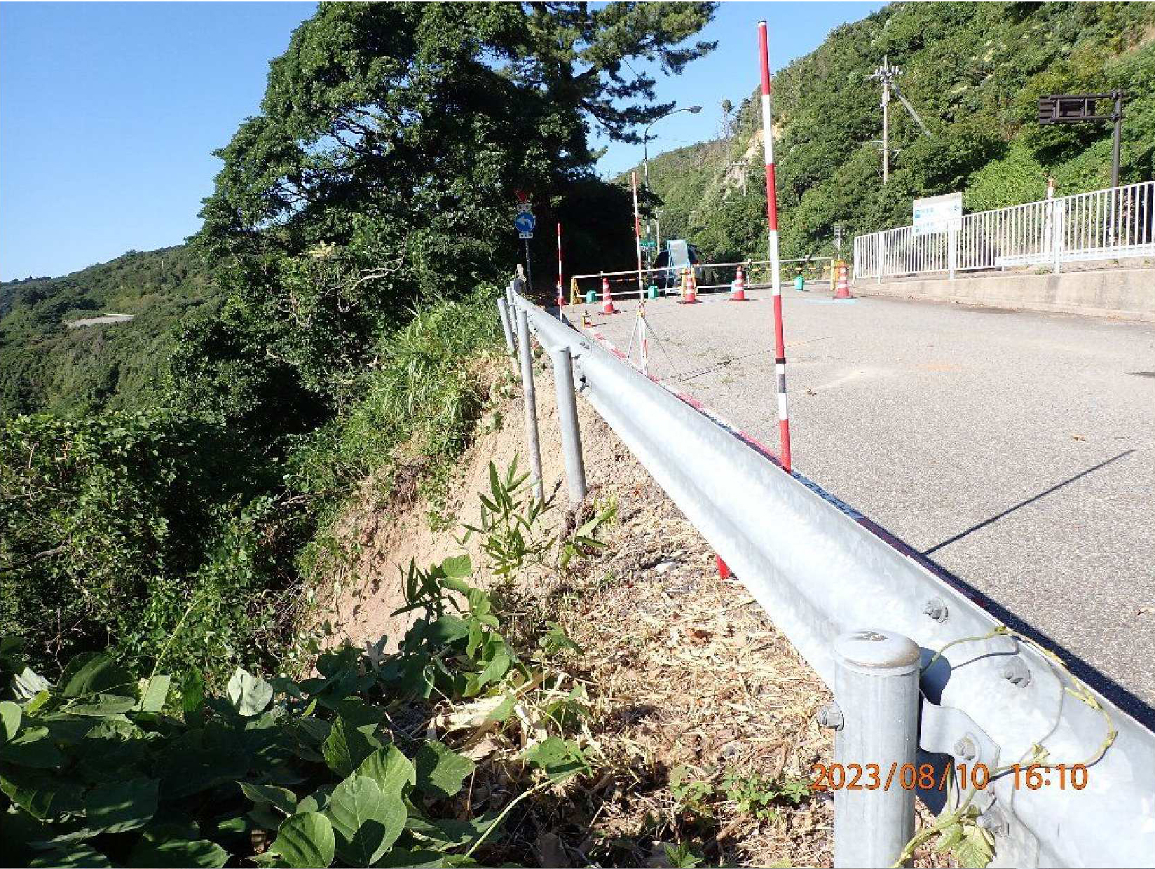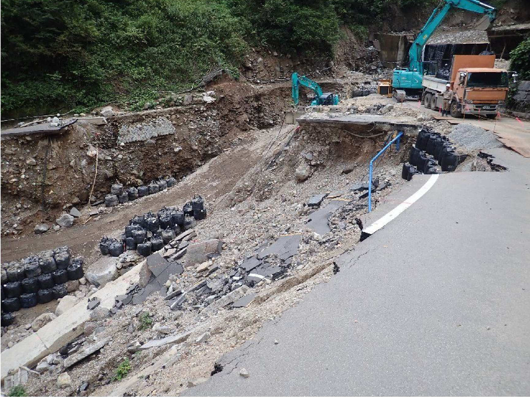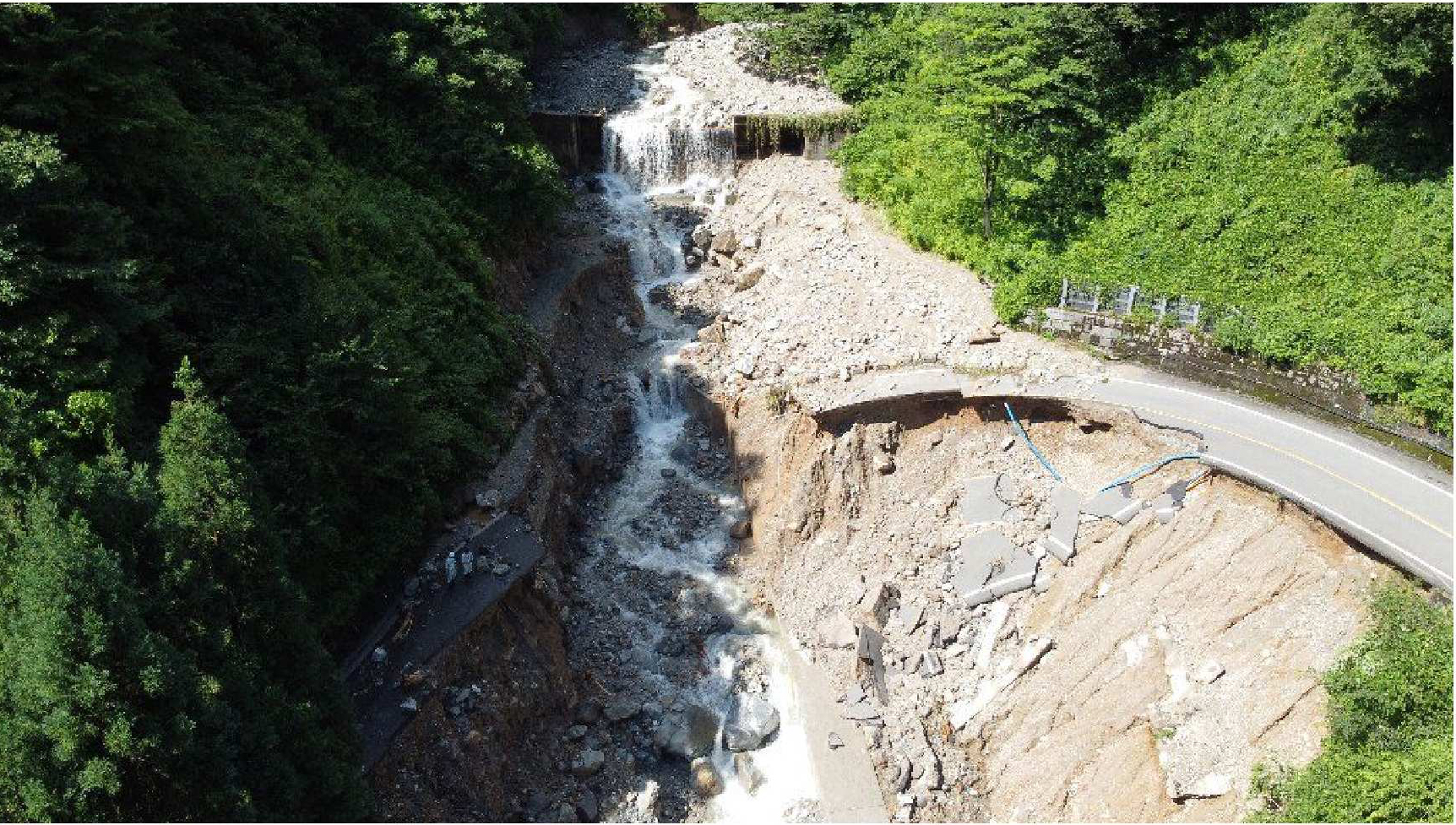被災原因は、町道と平行して山側に設置された県道および町道の表面水が集中したことにより、路肩部を越流し、盛土のり面を浸食したことによって崩壊に至ったものと推測しました。