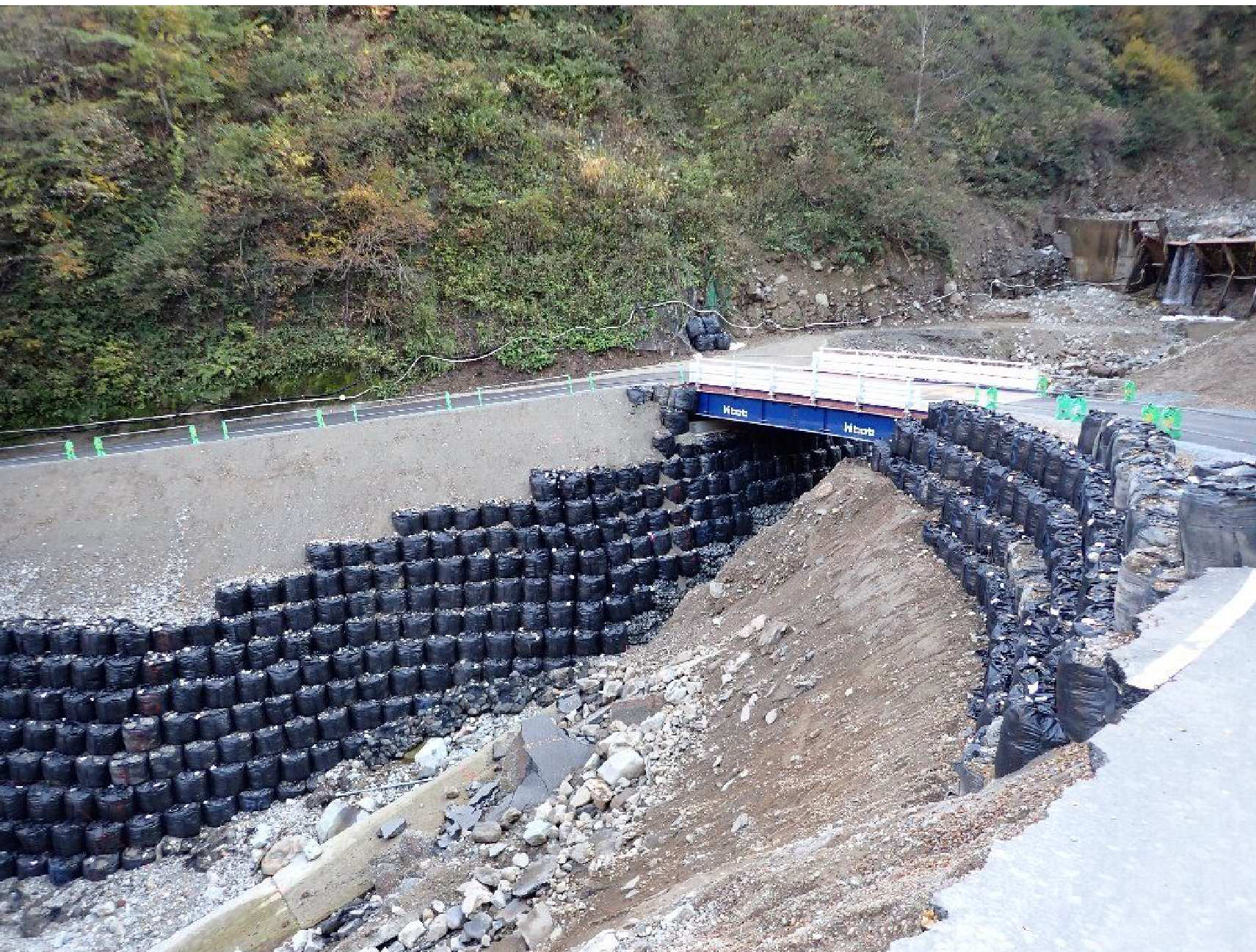 谷側路肩下は急斜面であったため、復旧は擁壁設置を基本とし、比較検討の結果、経済性・構造性に優れるジオテキスタイル工法による計画を立案しました。
