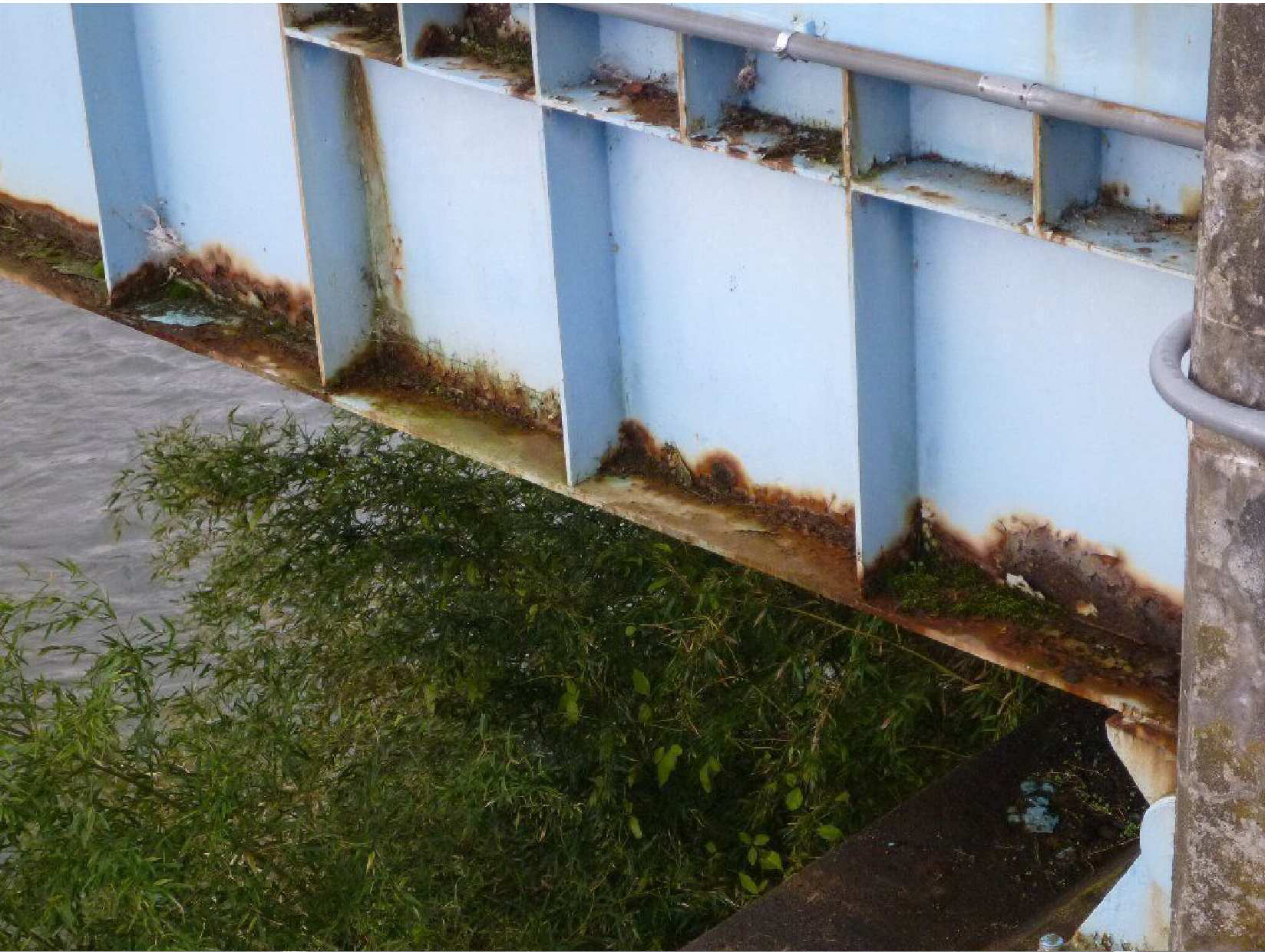 詳細調査の結果、上部工鋼材全体に錆が発生しており、特に主桁ウェブ下端部の腐食が著しく、広範囲に腐食による孔食が確認できました。そのため、上部工鋼材全体の塗装塗替えを計画し、孔食箇所には当て板による補修計画を立案しました。