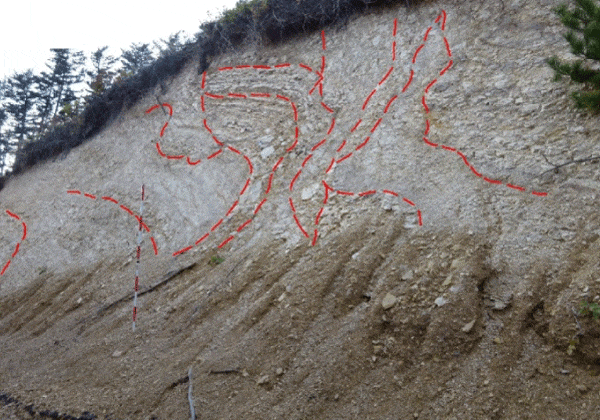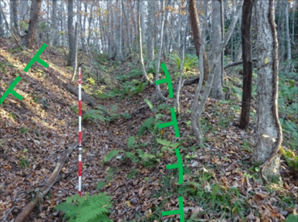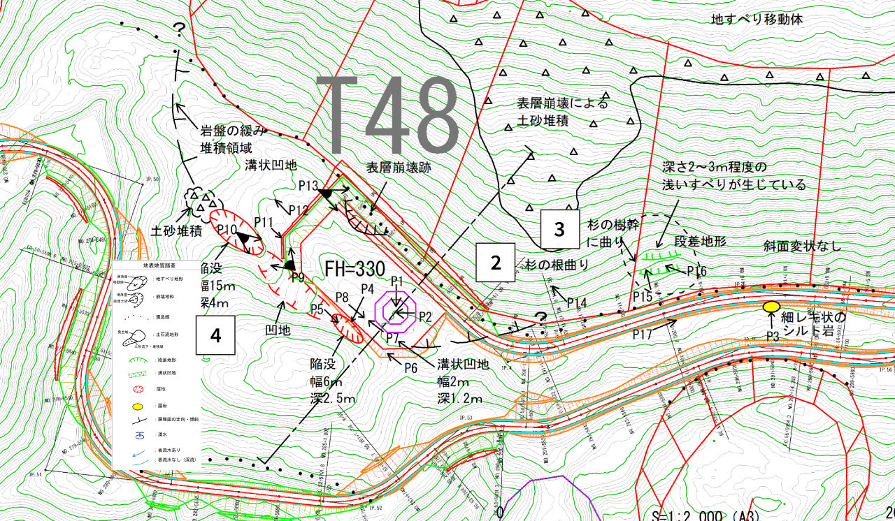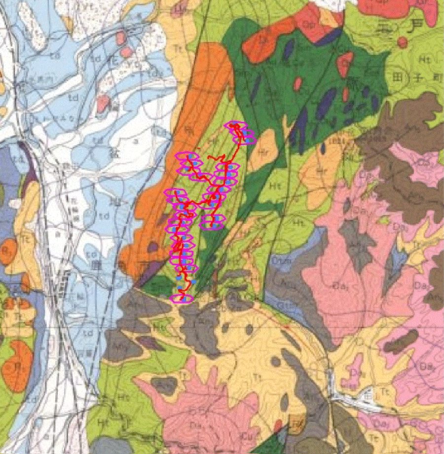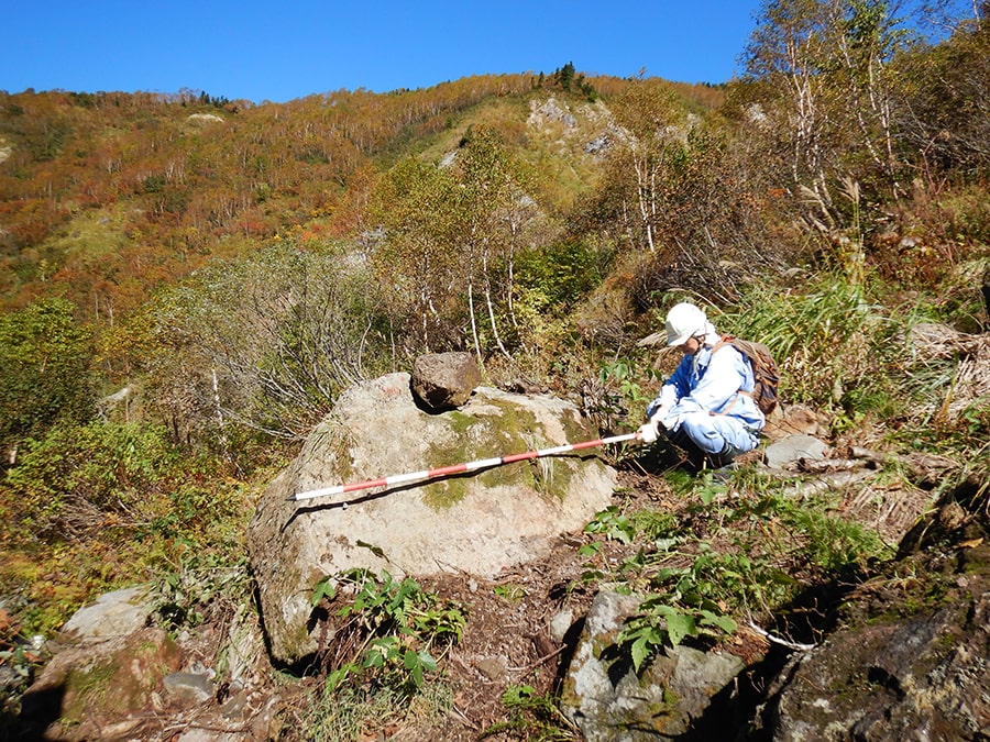 当社では知識と経験の豊富な専門技術者が地表地質踏査を行い、机上調査では把握できない微地形の確認のほか、露頭、転石などを詳細に観察し、計画地域の地質平面図・断面図を作成します。