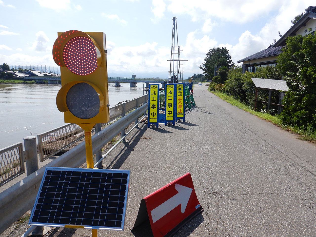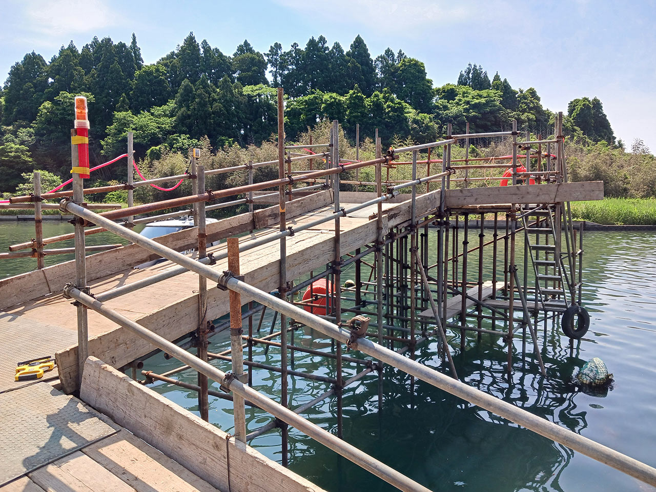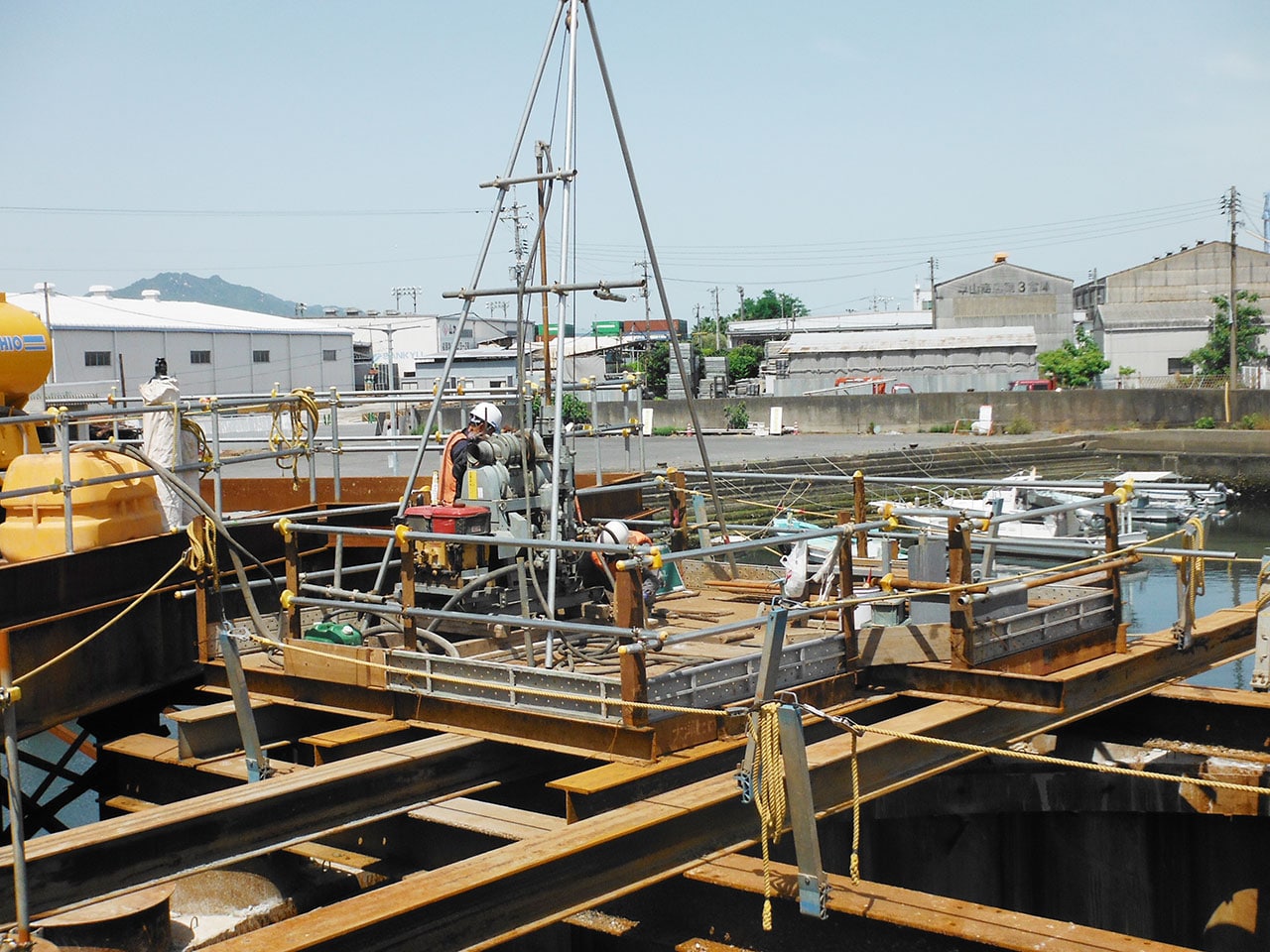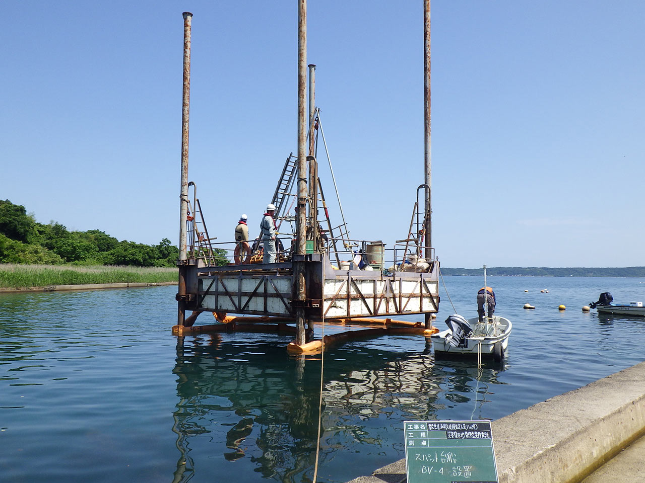 海上ボーリングのうち、水深が浅い場所では、桟橋足場を仮設。