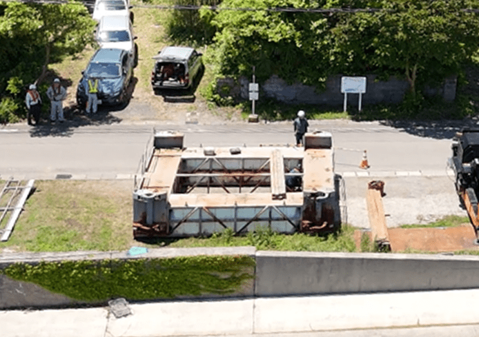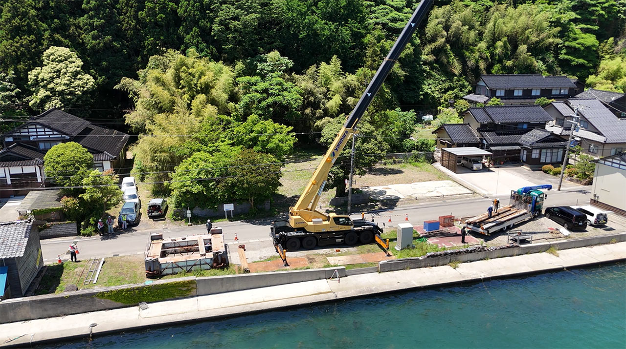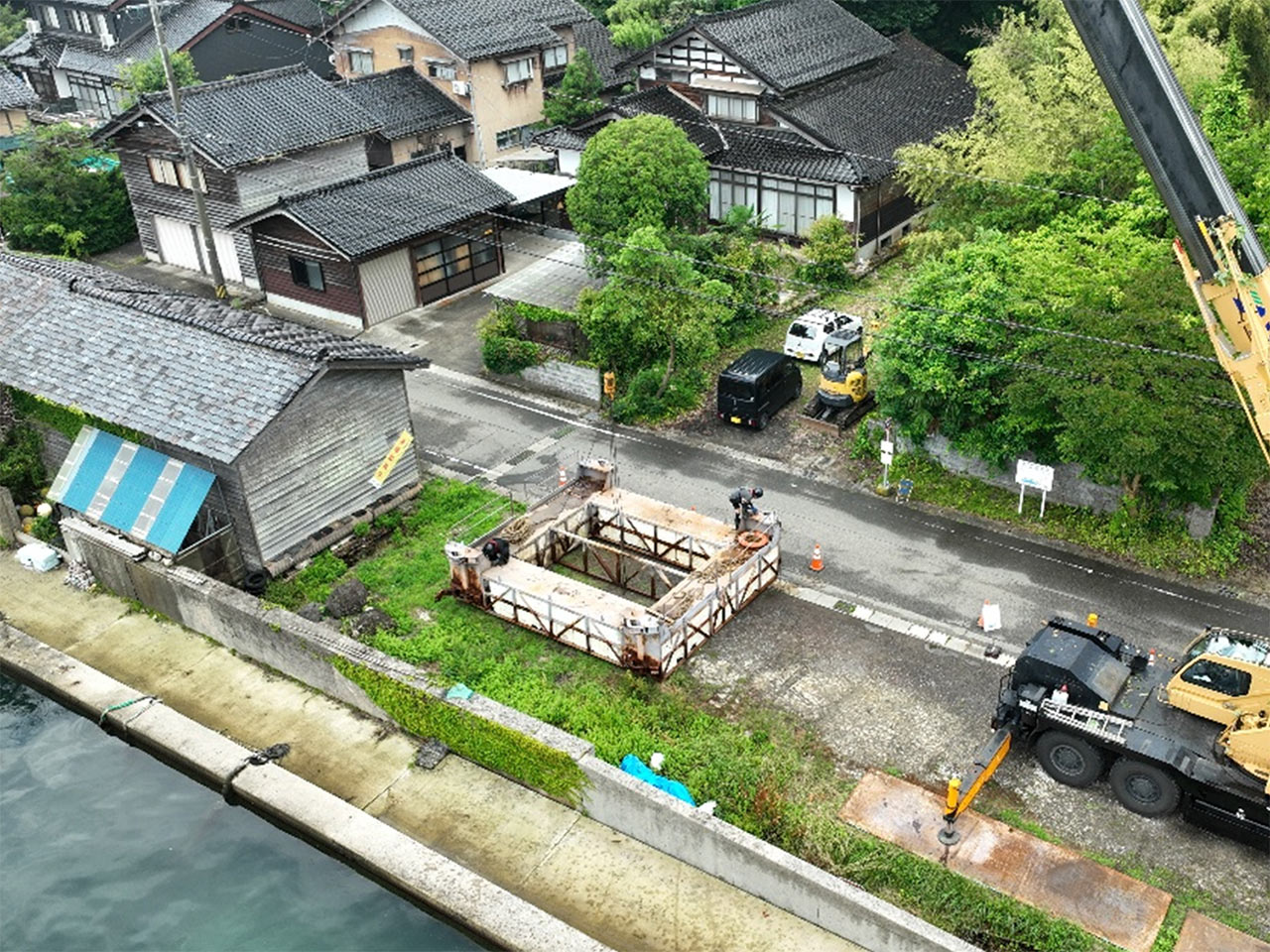 陸上の限られた敷地内でスパッド台船を組み立てる必要があり、小型の台船を使用。