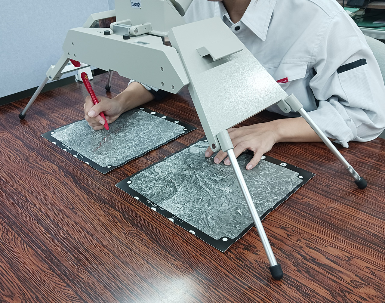 作成した立体地形図を用いて空中写真判読よりも細かな地形判読を行います。