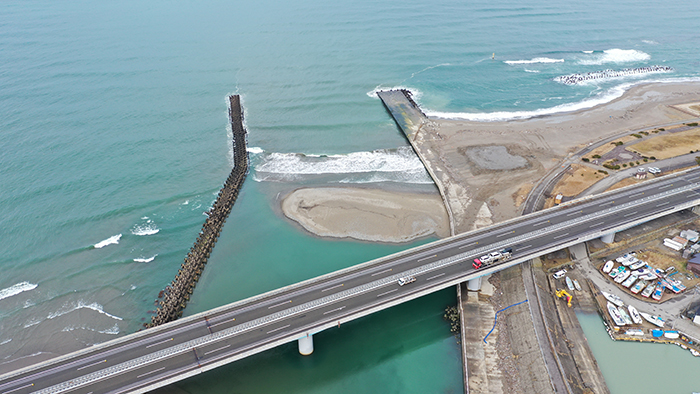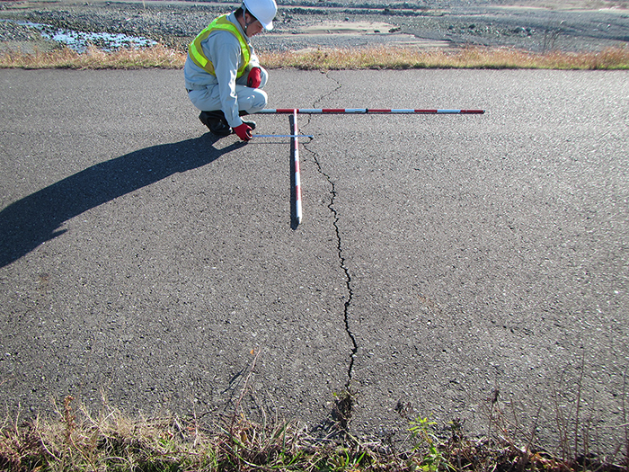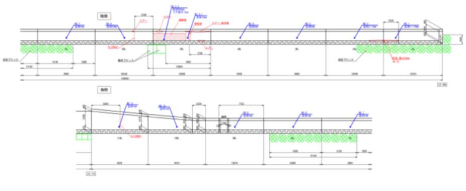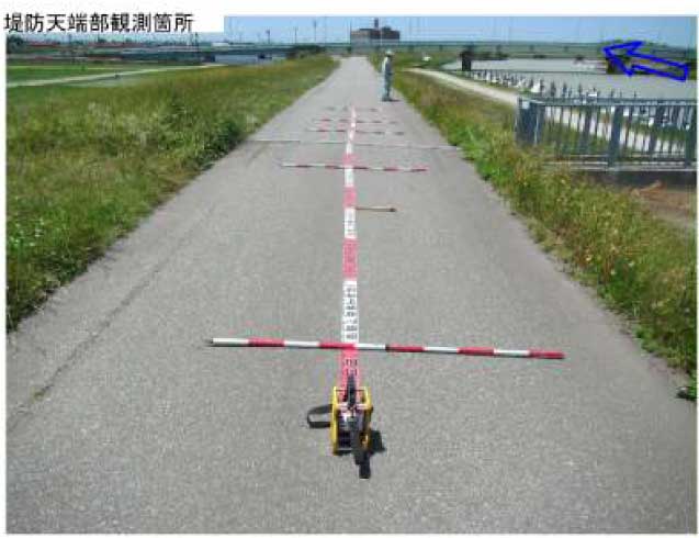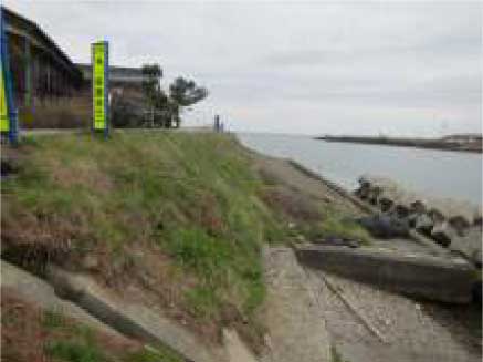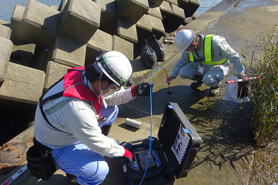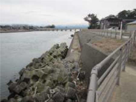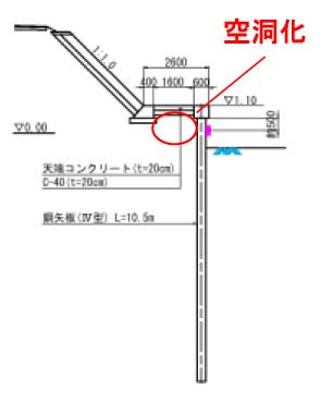 梯川の護岸において、波浪による鋼矢板護岸の腐食等により孔食欠損が発生し、護岸背面の空洞や堤防の緩みによる陥没が発生している。 空洞化調査等により、空洞化の範囲及び深さを推定し、修繕工法検討の資料とした。