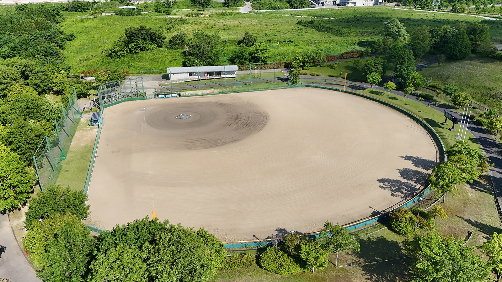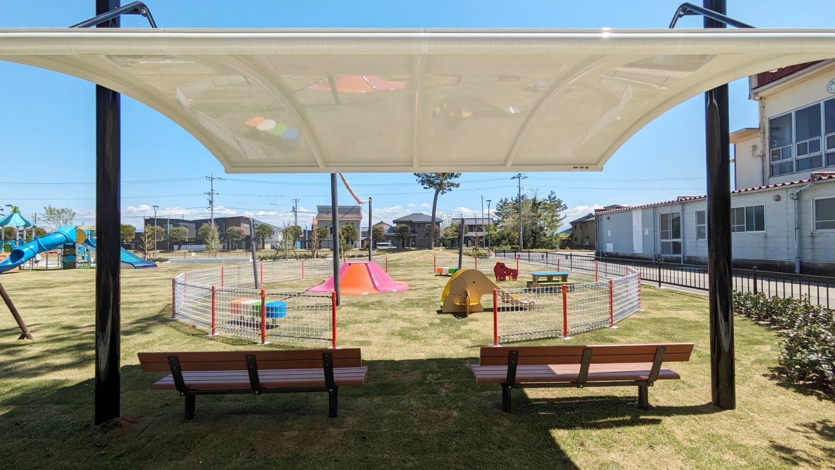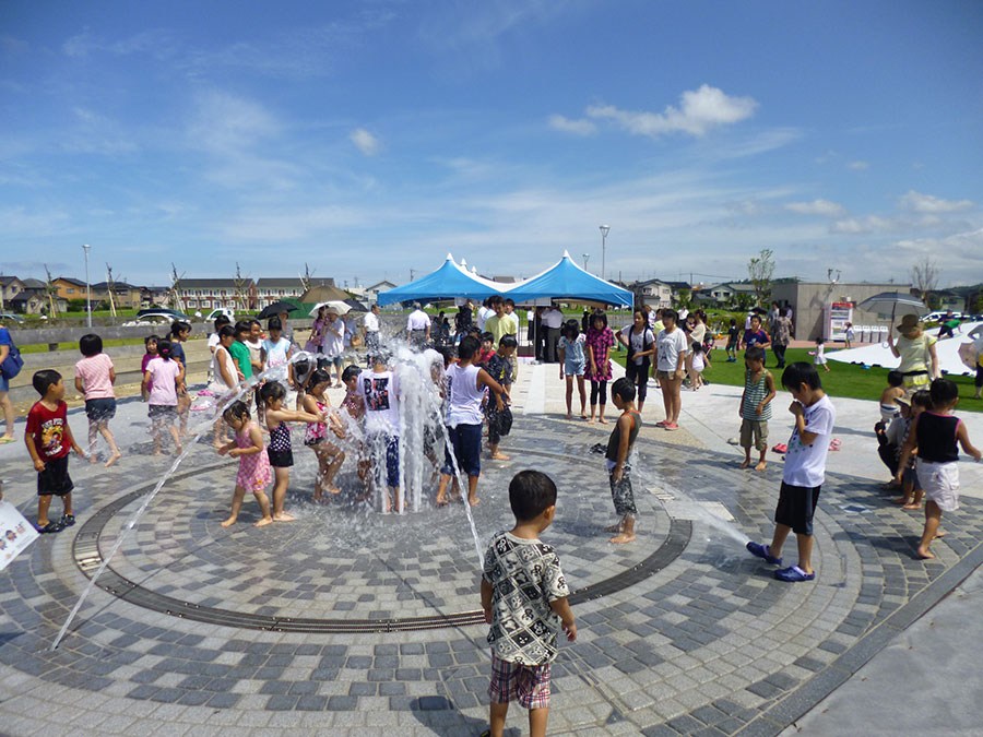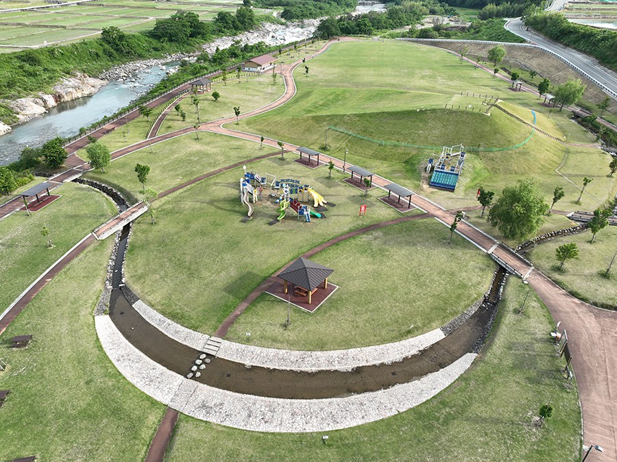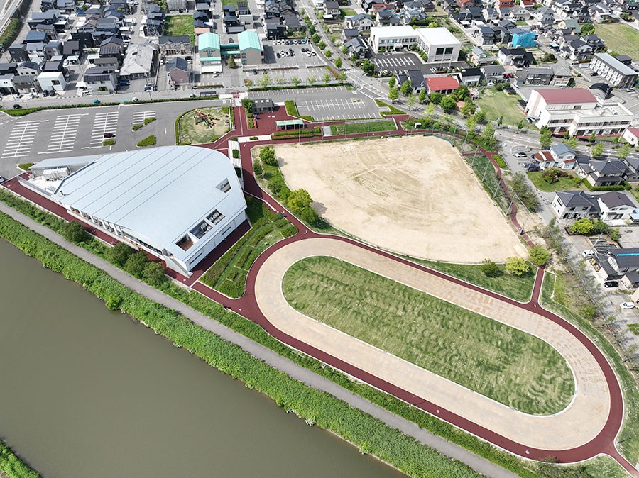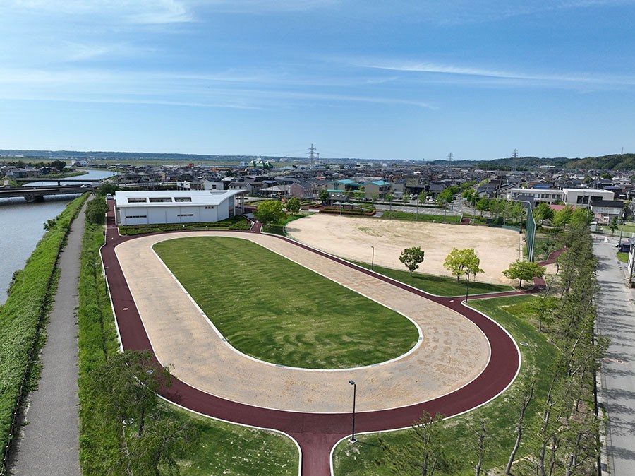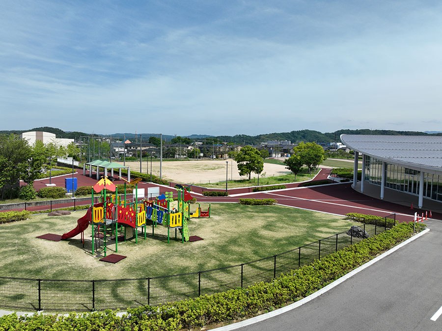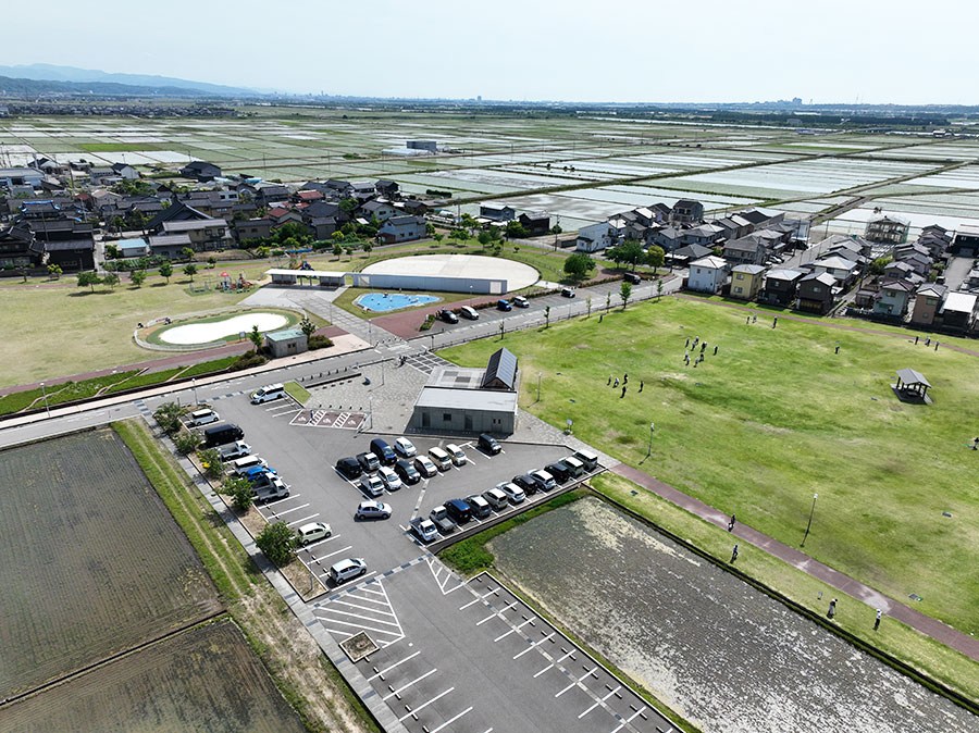 面積4.3haの防災公園として平成28年に開設しました。 県内最大級のふわふわドーム、噴水広場、グラウンドゴルフ場、多目的広場、防災備蓄倉庫などが整備されています。 測量、土質調査、軟弱地盤解析、地元まちづくり委員会との調整、許認可(農振解除・雨水排水等)、施設設計、建築設備設計まで一貫して業務に携わりました。