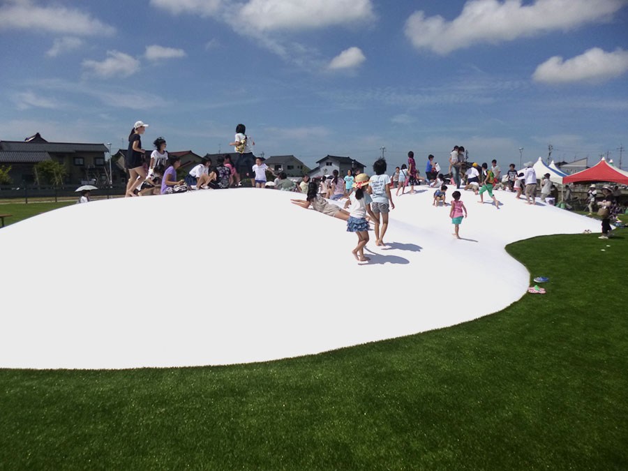 「雪」をテーマにした通年利用型の公園です。夏は大きな芝生の築山をサマーゲレンデとして利用でき、水遊びなどができる「せせらぎ水路」、雪をイメージした大きな複合遊具が整備されています。
