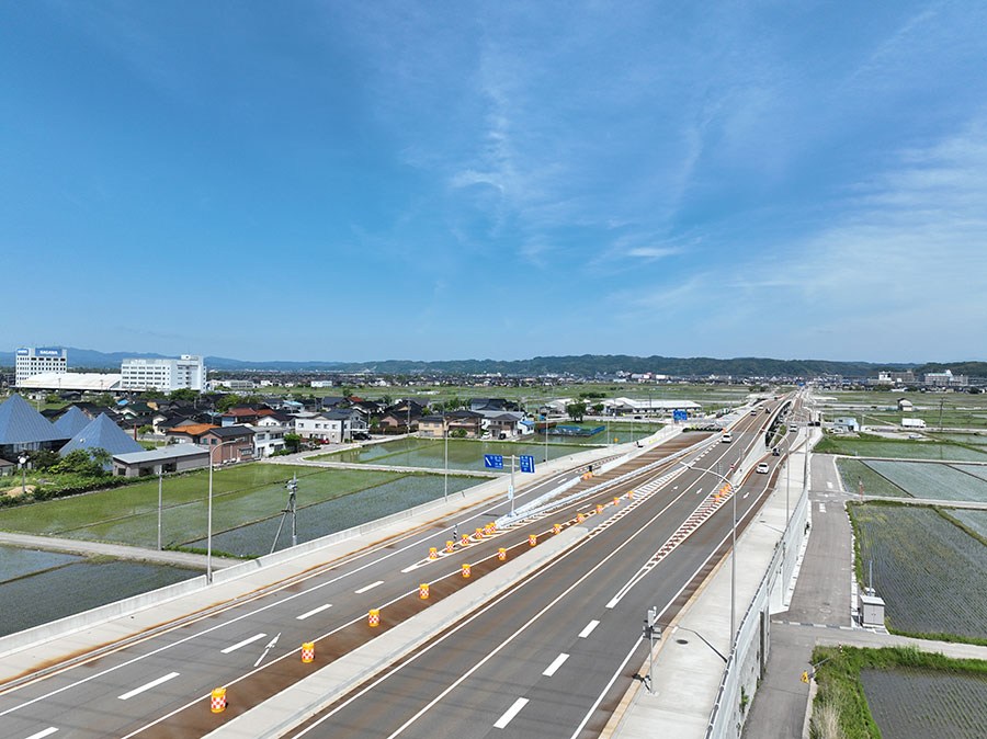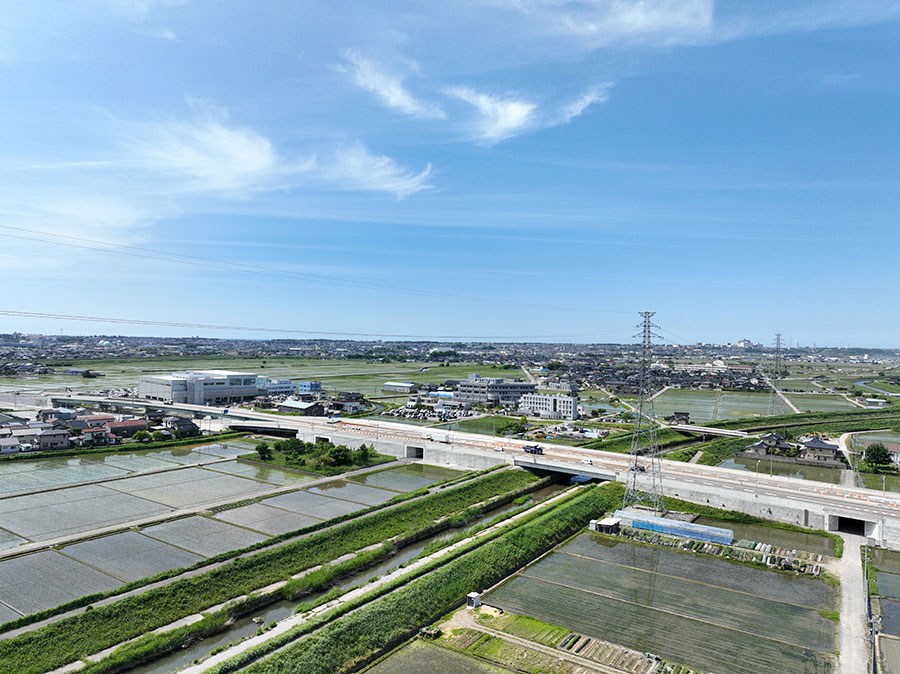 令和4年11月、金沢都市圏の骨格を形成する金沢外環状道路海側幹線(金沢市大河端~福久町)の山側車線が供用されました。 供用区間3.2kmのうち、約2km区間について平成24年から設計を行い、現在も海側車線や付帯施設等に関する設計に携わっています。 設計内容は、道路、交差点、構造物、調整池、照明、パイプラインなど多岐にわたっています。