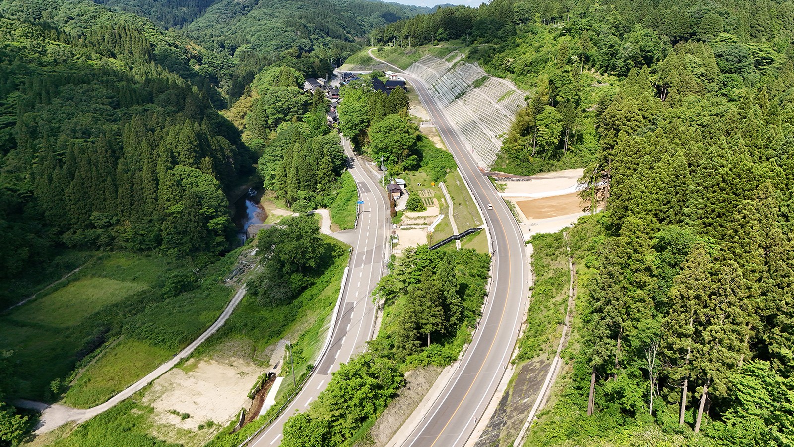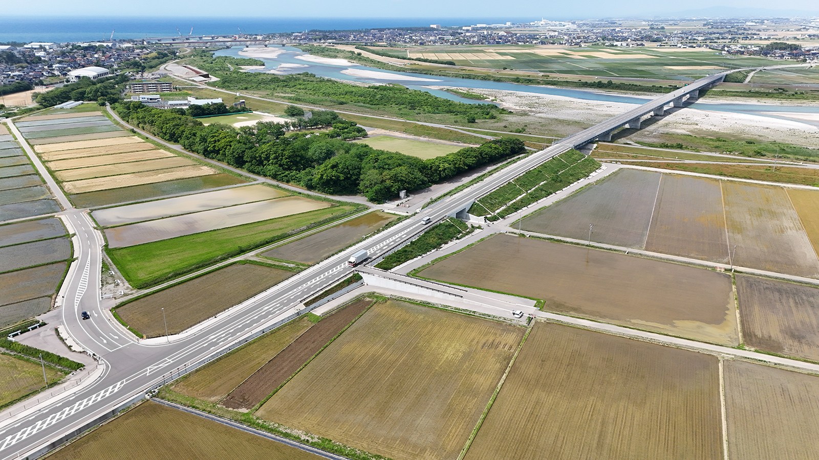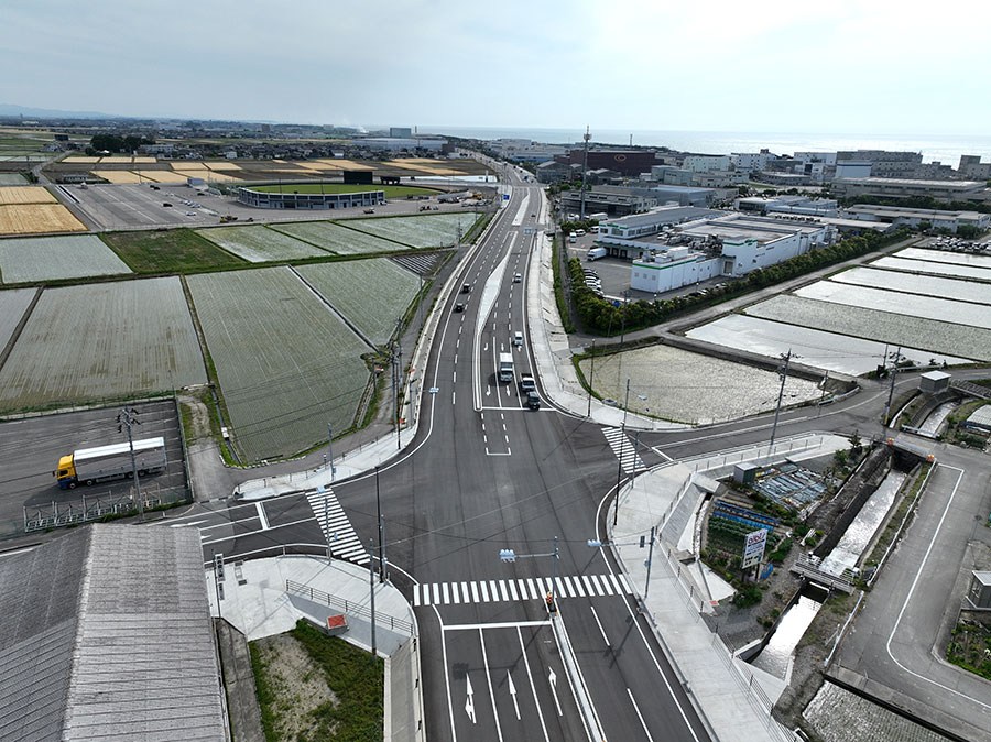 令和6年4月、加賀地域と金沢港を結節する加賀海浜産業道路(白山市小川町~松本町)の4車線化が完了、供用されました。 設計に際しては3次元による設計を行うとともに、1日当り2万台を超える交通流を確保しながら道路切り下げ工事を行う必要があり、複雑な施工ステップを可視化するため時間軸を組み合わせた4D 施工計画によって見える化を図りました。