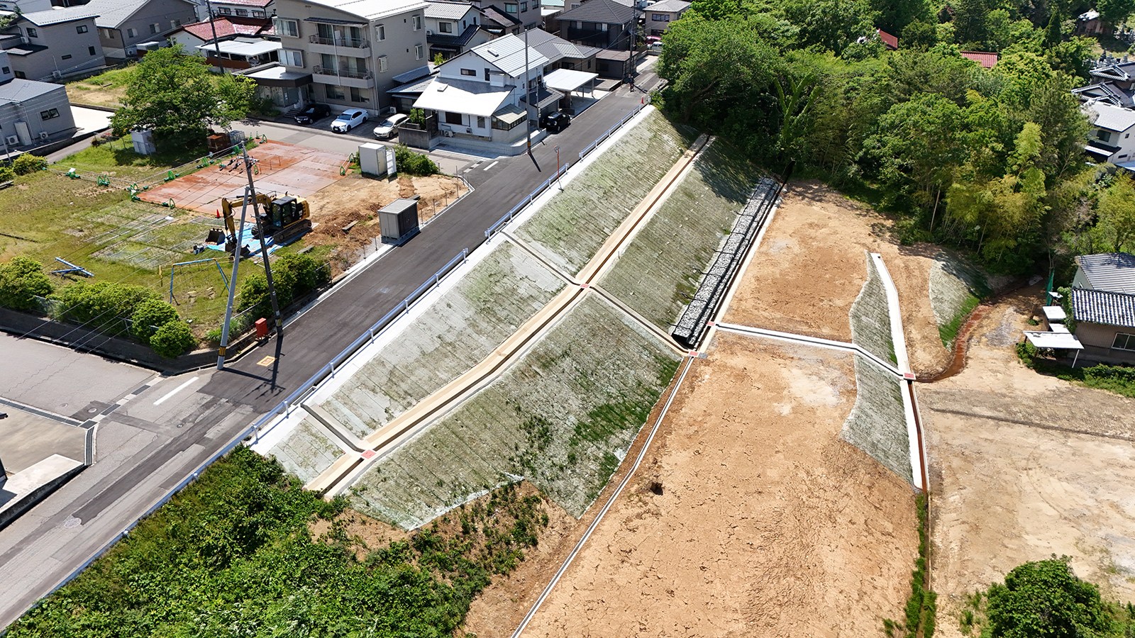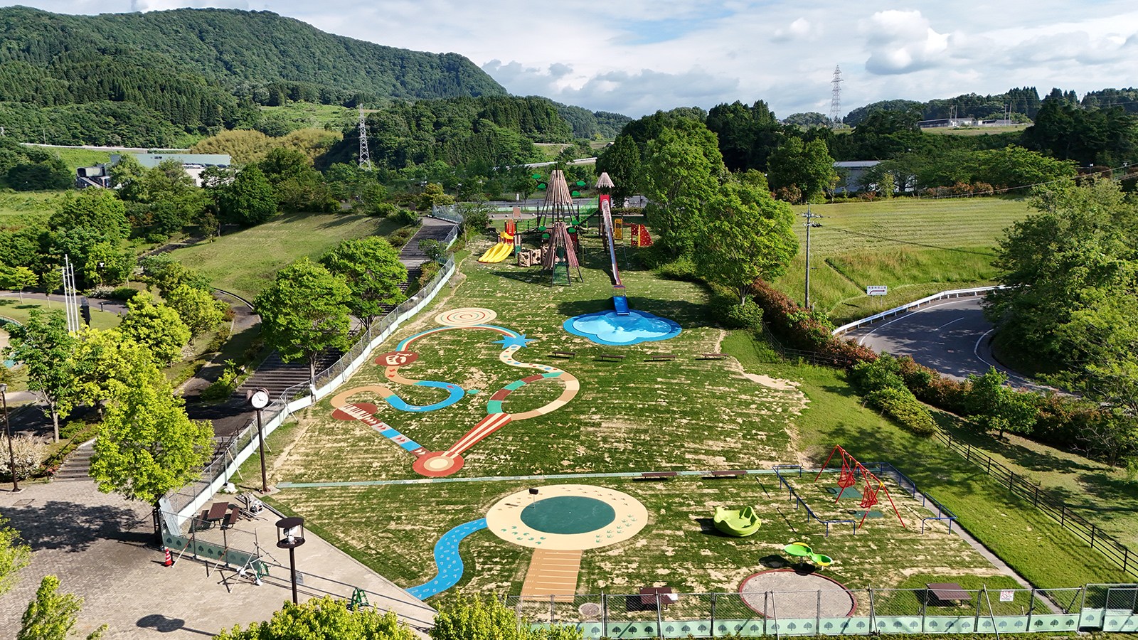 老朽した公園のリニューアルとして令和2年より設計に着手し、温水プール、運動場、球技場、ウォーキングコースなどを併設した健康増進に資する公園として令和6年に完成しました。 コスト削減を図るため遊具の再利用、樹木医診断による既存樹木の移植を行っています。 また、地域の内水抑制を図る雨水地下貯留施設を備えた公園となっています。