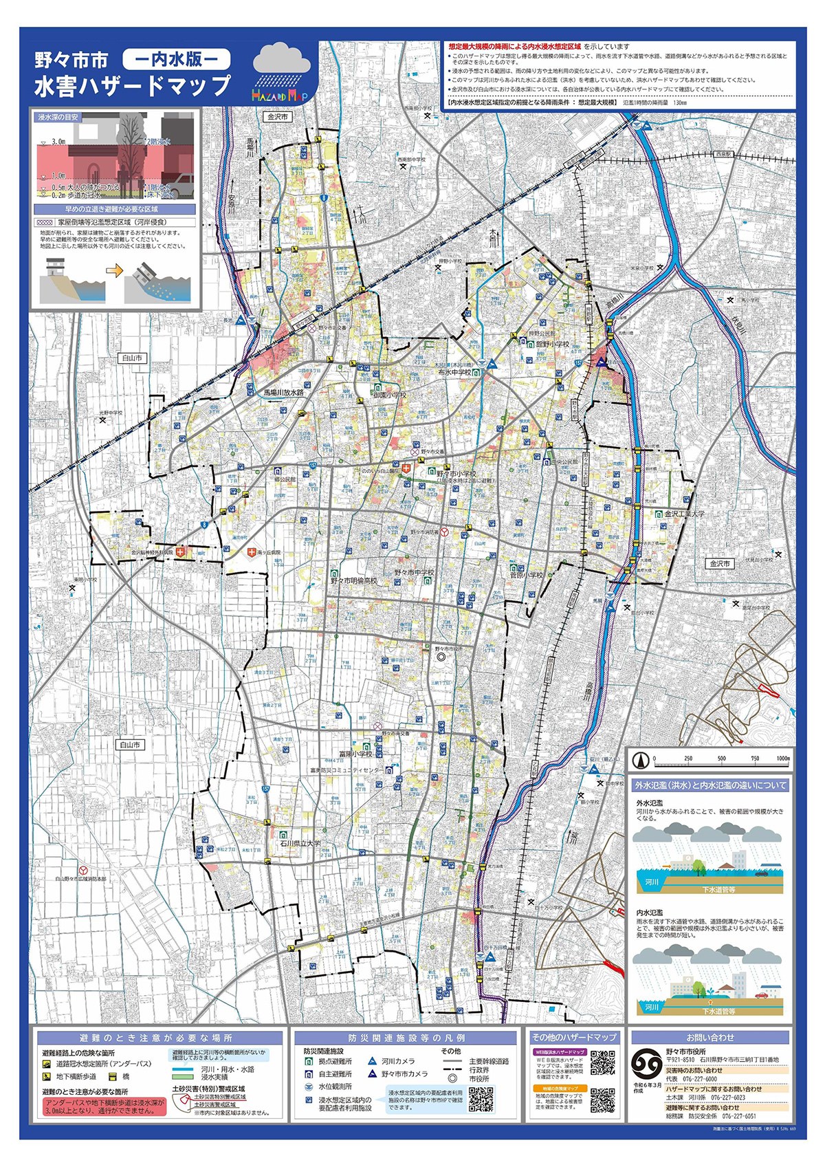 想定し得る最大規模降雨によって市街地で水が溢れた際、安全に避難するためのツールとして利用することを目的とし、シミュレーション(コンピューターによる解析)による浸水想定区域の設定と、内水ハザードマップの作成を行いました。